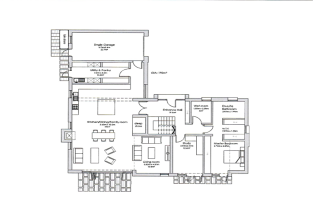 The consented house provides an open plan kitchen, dining and living room together with master bedroom, ensuite bathroom, wet room, study, utility room and garage on the ground floor. The first floor provides 3 further bedrooms and 2 further bathrooms. The gross internal floor areas are: